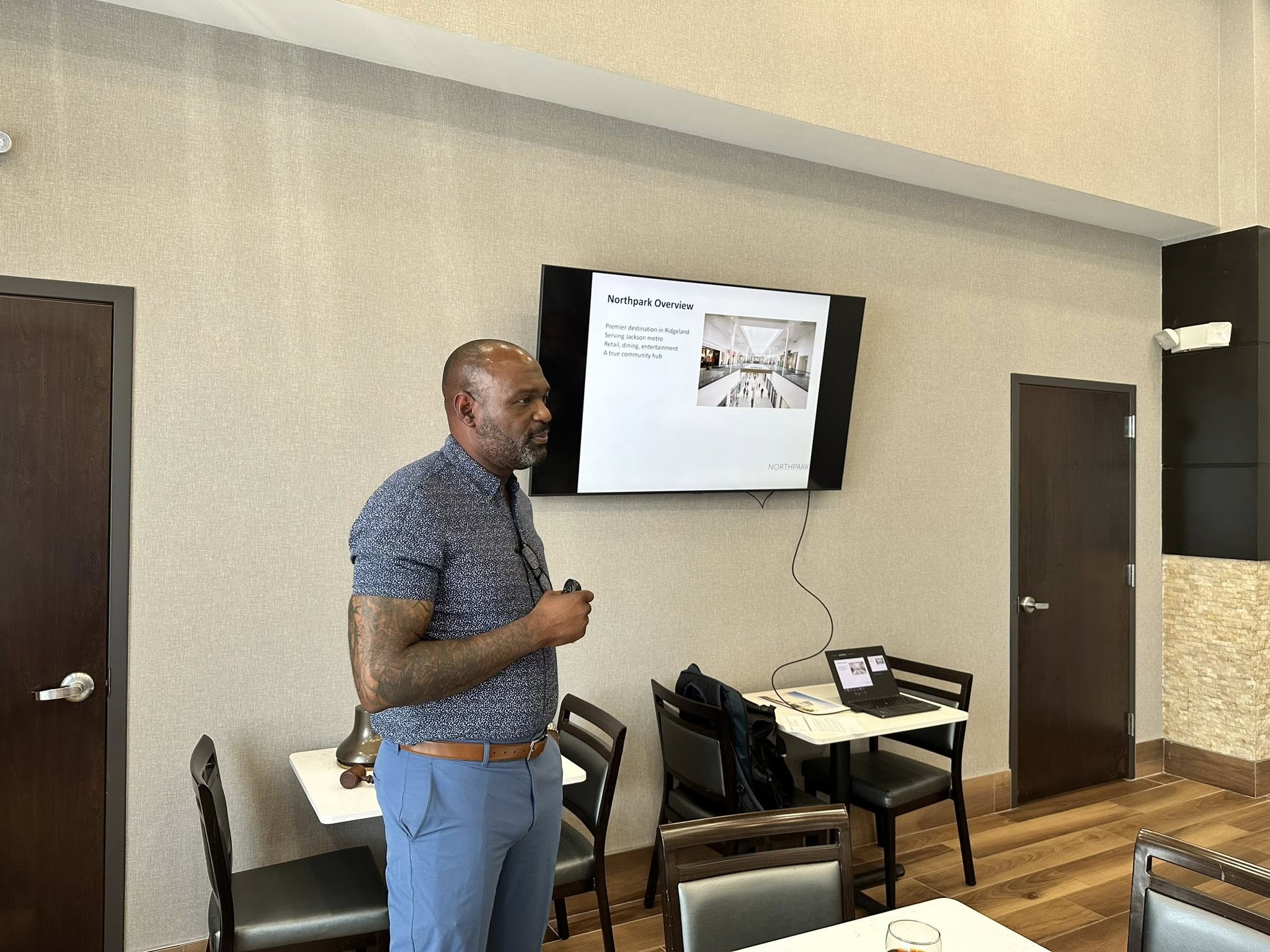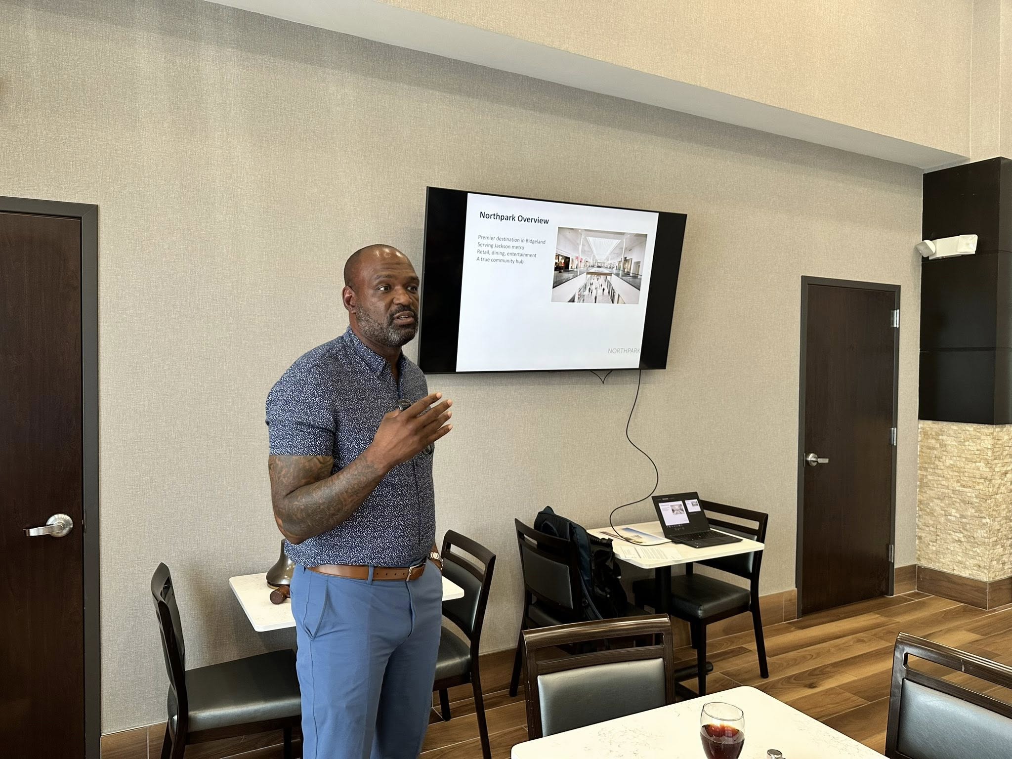Onassis Burress, General Manager of Northpark Mall speaks with members of the Madison-Ridgeland Rotary Club about Northpark’s plans for community engagement.